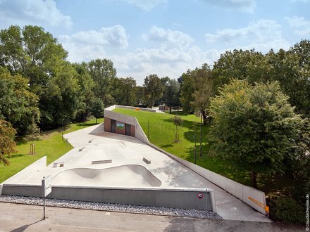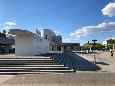 Blick über eine große, gepflasterte Fläche auf ein modernes Gebäude mit schrägen Stützen und Glasfassade, im Hintergrund Stadtgebäude und Bäume.