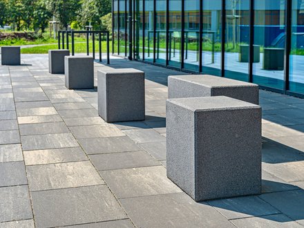 Blick über eine große, gepflasterte Fläche auf ein modernes Gebäude mit schrägen Stützen und Glasfassade, im Hintergrund Stadtgebäude und Bäume.
