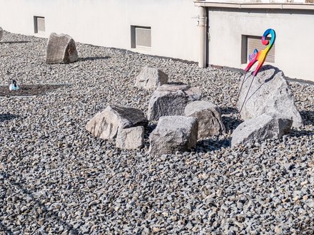 Freitreppe mit grasbedeckten Seitenflächen vor einem modernen, geschwungenen Gebäude mit weißer Fassade und dunklem Unterbau.