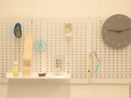 Werkstatt/Studio: zwei Personen, eine auf einer Leiter, befestigen Skizzen und Fotos an einer hohen Wand; Holzleisten, Tische und weitere Leitern stehen im Raum.