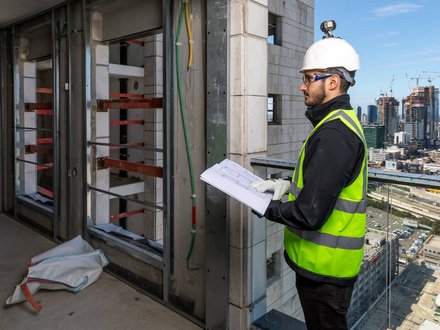Person mit weißem Schutzhelm und orangefarbener Warnweste hält ein Tablet in einer Baustellenumgebung mit Gerüst im Hintergrund.