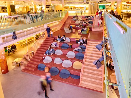 Multifunktionaler Innenraum: Holzpodeste, Pflanzen, Treppen und Menschen in Bewegung, kombiniert mit Spiel- und Arbeitszonen.