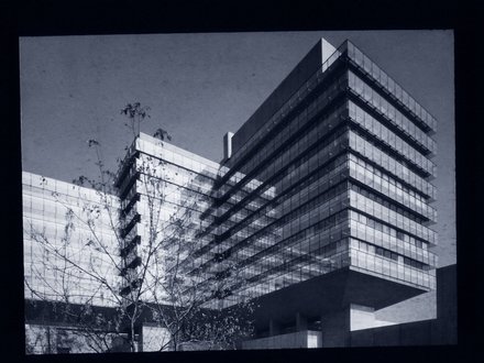 Blick über eine große, gepflasterte Fläche auf ein modernes Gebäude mit schrägen Stützen und Glasfassade, im Hintergrund Stadtgebäude und Bäume.