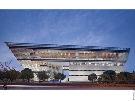 Blick über eine große, gepflasterte Fläche auf ein modernes Gebäude mit schrägen Stützen und Glasfassade, im Hintergrund Stadtgebäude und Bäume.