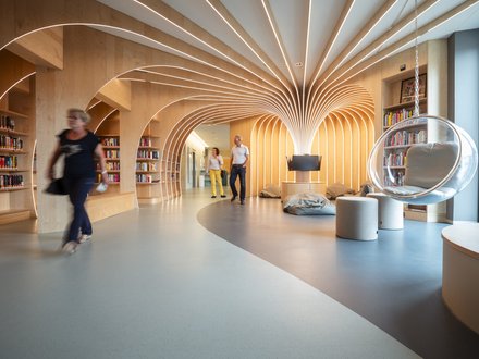 Moderne Gemeindehalle mit weißer Fassade und Holzverkleidung, davor eine Person auf einem Gehweg, umgeben von Rasen und Bäumen